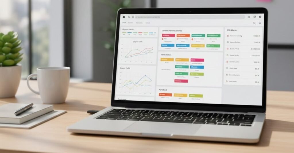 A professional content strategy dashboard showing goals, KPIs, and organic traffic metrics. Modern SaaS UI, clean layout, editorial business photography style, landscape orientation.